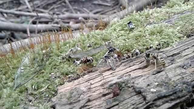 A moss forest on a log is visited by a wasp who grabs a dead bug and flies away