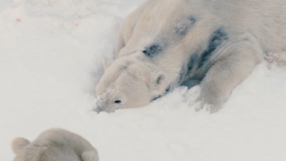 Полярный мишка играет со снегом