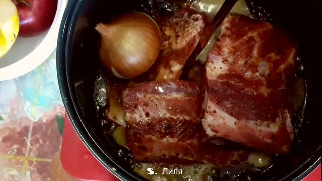 В мультиварке ребрышки в пиве с айвой и яблоком.