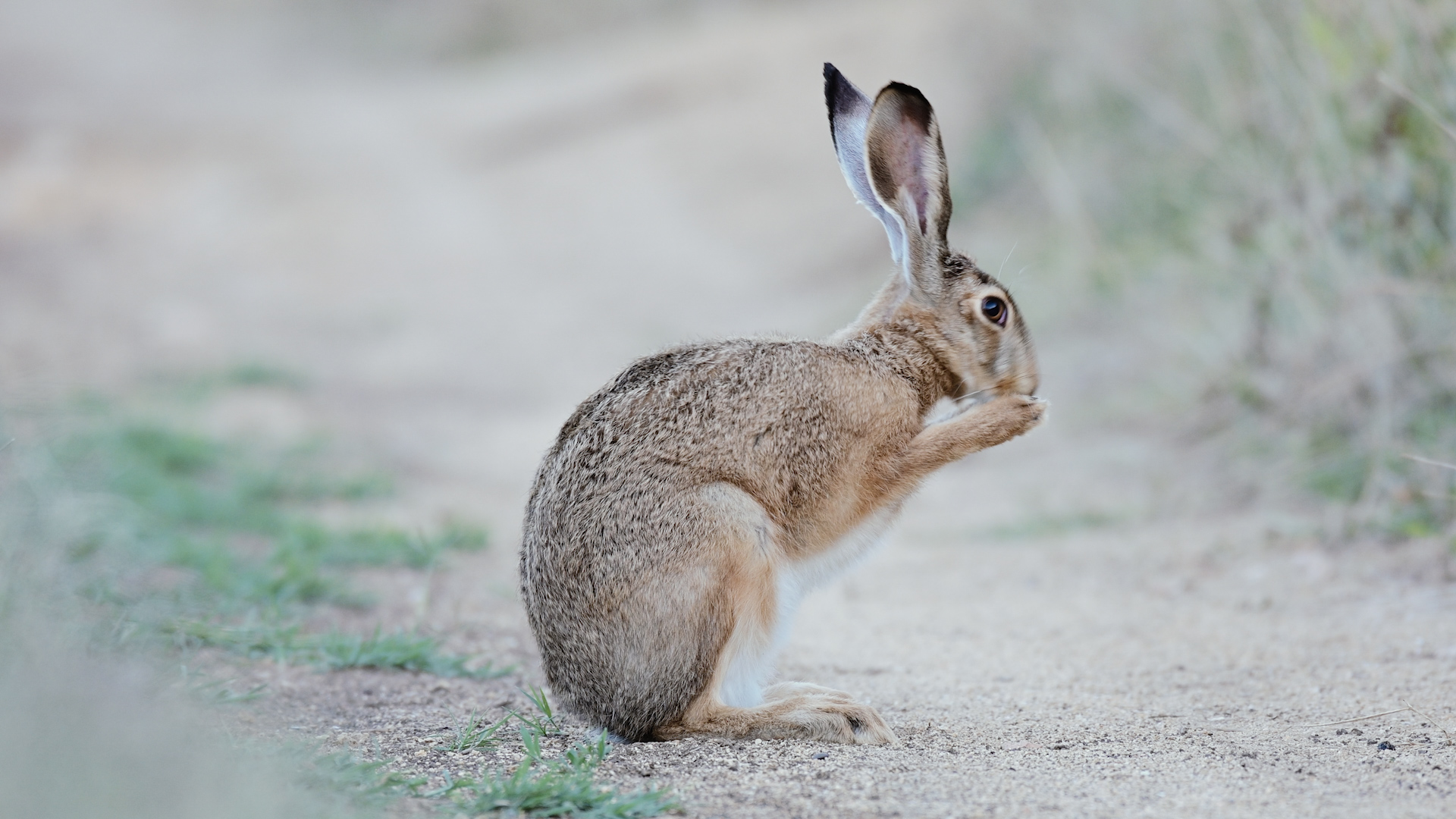 Заяц чешется и умывается на проселочной дороге.