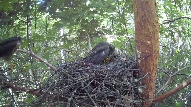 Самка ястреба-перепелятника ест в гнезде добычу и к ней возвращается слёток ( Accipiter nisus )