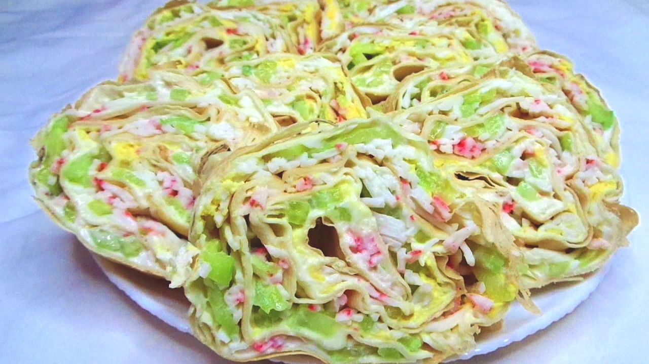 Закусочный рулет из лаваша с крабовыми палочками и свежим огурцом, вкусно и просто