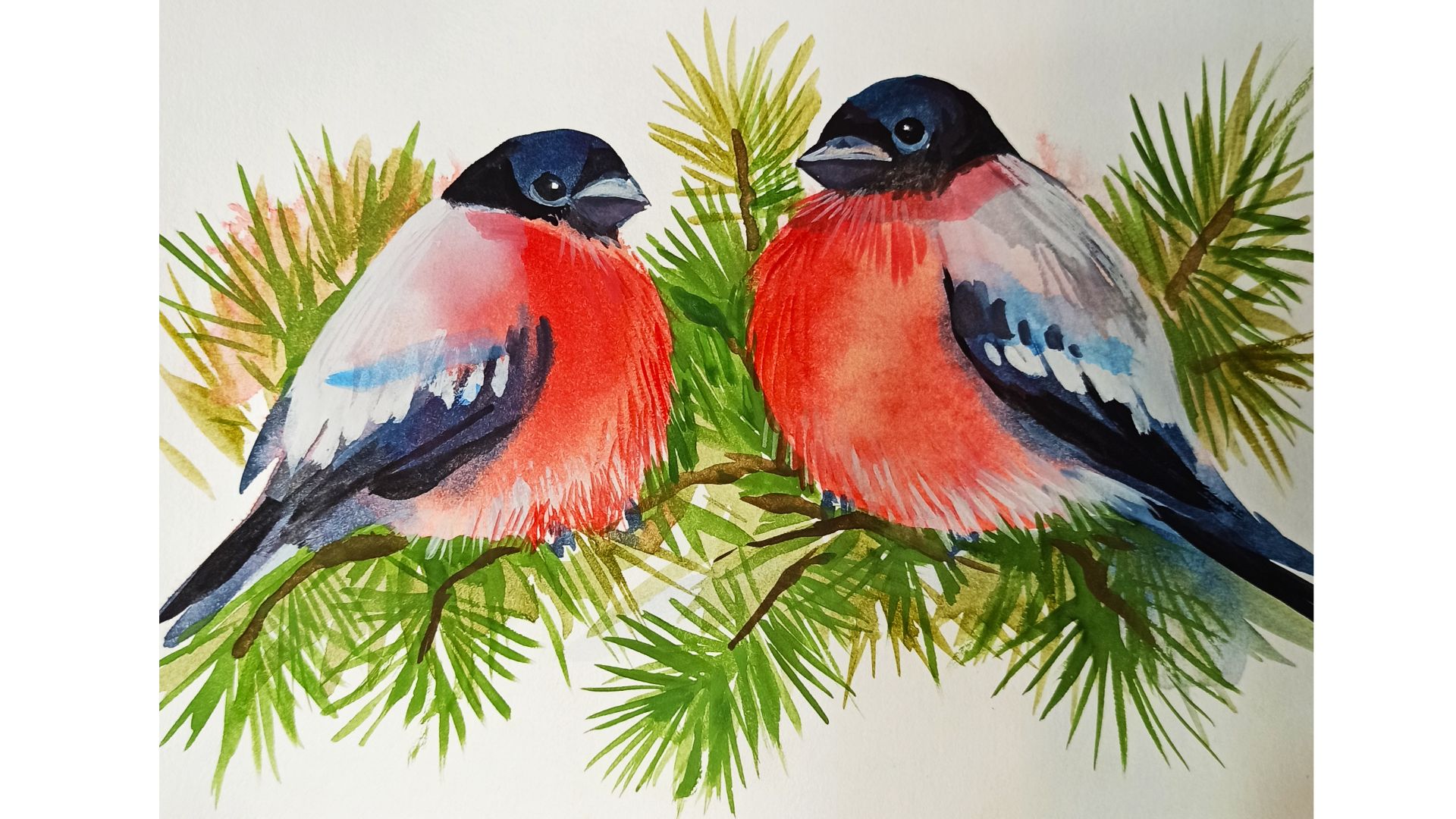 Снегири. Рисунок акварельными красками.