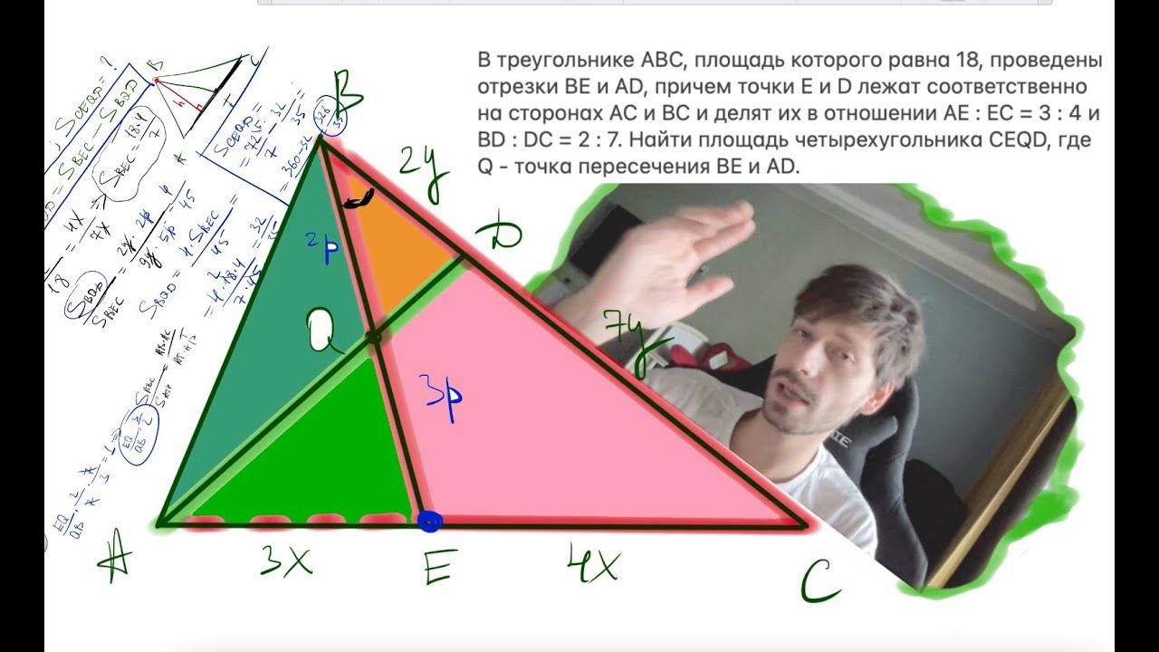 В треугольнике АВС, площадь которого равна 18, проведены отрезки ВЕ и AD, причем точки Е и D лежат с