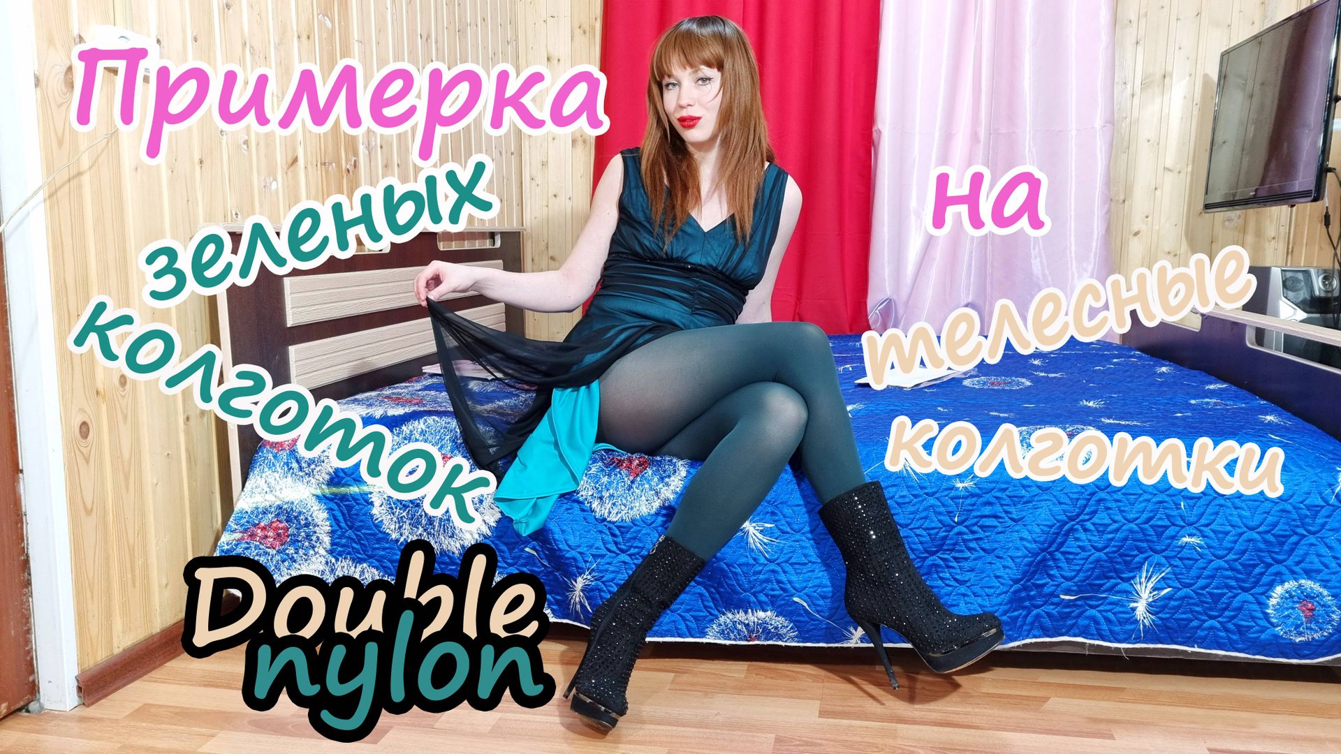 Примерка черных сапожек с блесками и темно зеленых нейлоновых колготок поверх телесных колготок