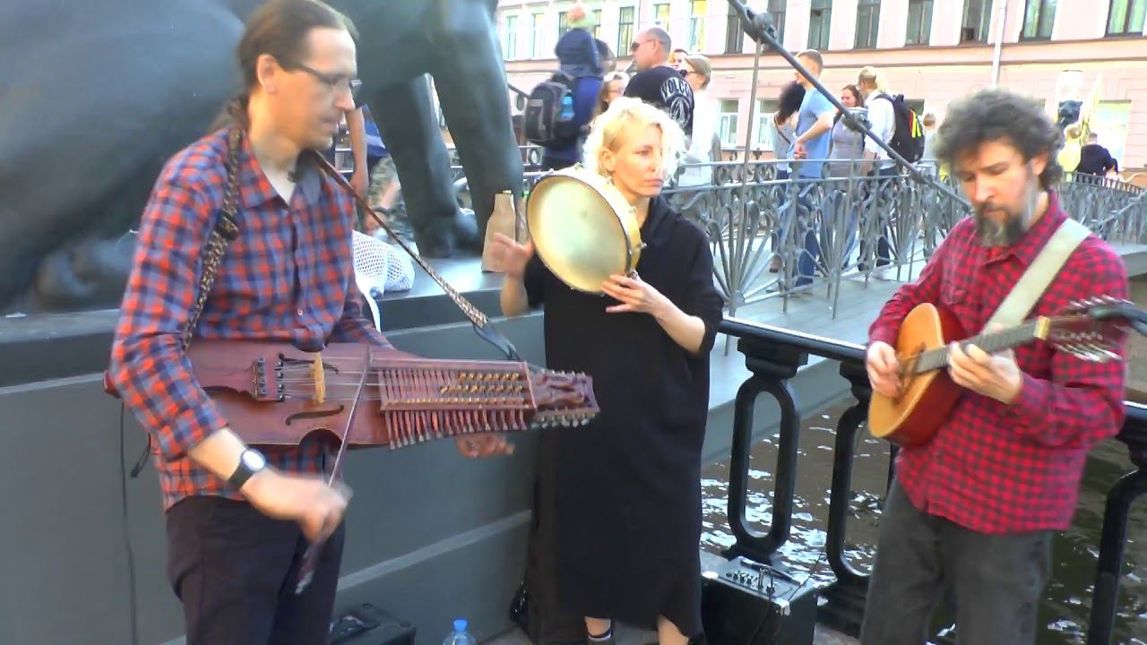 Уличные музыканты Петербурга, никельхарпа и домра, 2019г
