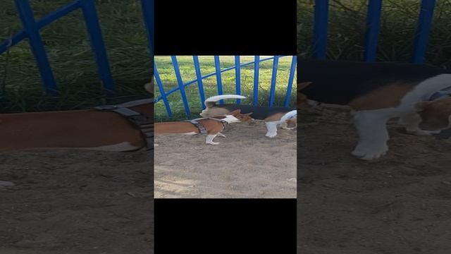 Щенок Бигля 4 месяцев и щенок Басенджи 10 месяцев, Игра на собачьей площадке.