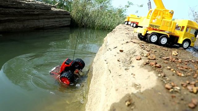 Машинка на радиоуправлении тянет трактор из грязи