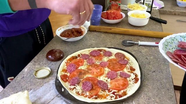 "Вкуснейшая быстрая пицца с копченой курочкой ,колбаской и жареным луком"