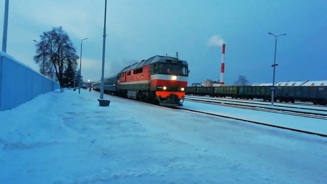 Тепловоз ТЭП70-0223 с пассажирским поездом "605 Полоцк-Гомель-Брест" отправляется со станции Полоцк
