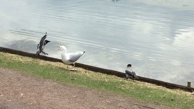 Парк «ЕКАТЕРИНИНСКИЙ». Серебристая чайка поймала рыбу. Назойливые вороны. Москва. 4.04.23.