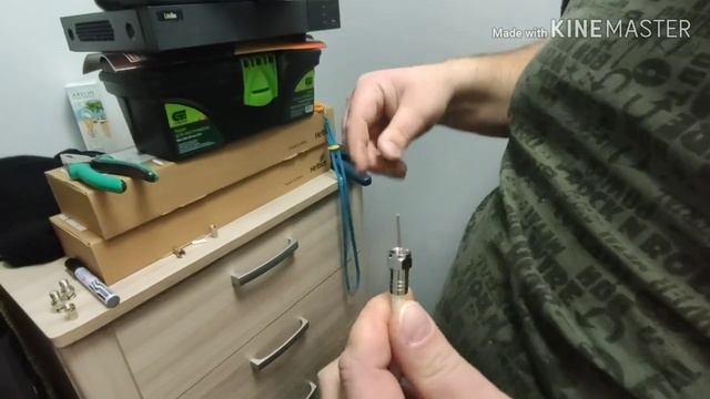 Папа надевает F разъём на антенный кабель.