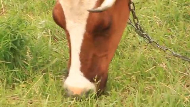 Корова кушает траву на лугу , корова жует траву , корова ест траву
