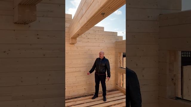 Сборка дома из клеёного бруса на участке с уклоном.