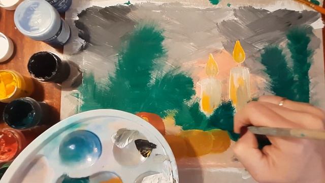 Как легко нарисовать Новогодний натюрморт гуашью. Мастер класс, рисуем свечи в еловых ветках.