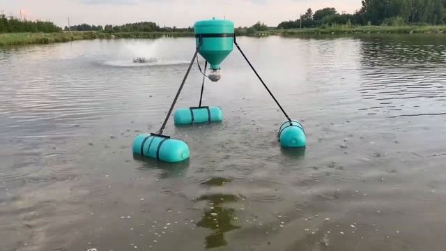 Автоматическая кормушка для кормления рыб в пруду и узв а так же аэраторы в работе