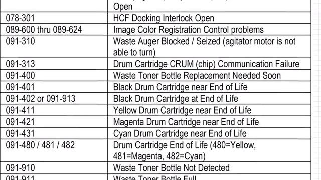 XEROX ERROR CODE FOR DC250 STYLE PRINTERS