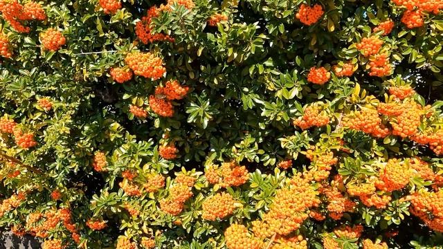 Autumn/Fall season Maple Leaves Turning Red Pyracantha firethorn shrub with berries orange color