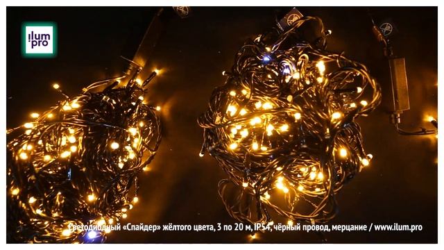 Светодиодная гирлянда «Спайдер» жёлтого цвета, 3 по 20 м, IP54, чёрный провод, мерцание / Айлюм Про