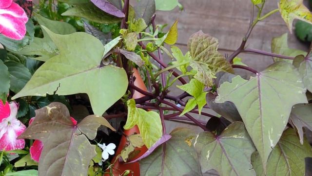 Горшечная композиция из Традесканции, Бальзамина, Ипомеи батат, Гипоэстеса, Лобелии.