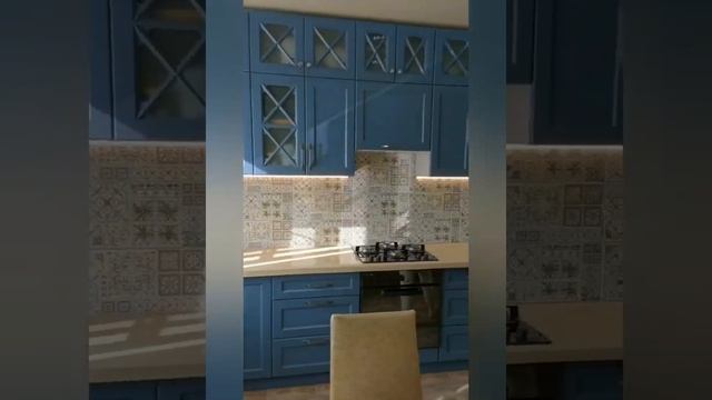 Красивая синяя кухня, цвет "массив деним" Доукомплектовали столешницей из листового камня.