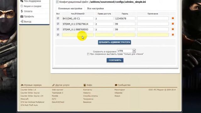 как прописать админку ксс в34 хостинг майарена