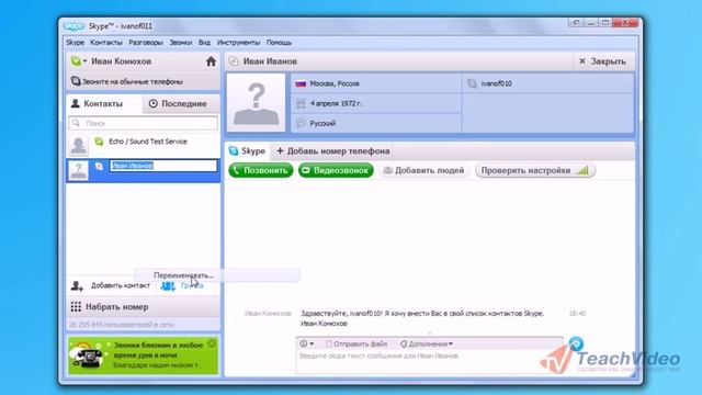 Работа с контактами в Skype (4/11)