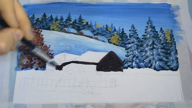 Как нарисовать поэтапно зимний пейзаж гуашью