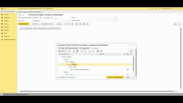 Ведомость по остаткам товара на складе с ценами и штрихкодами