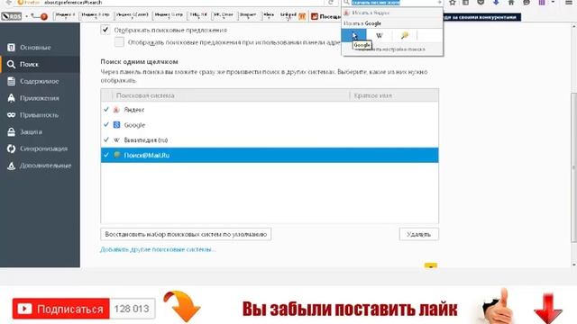 Как удалить yahoo поиск из firefox и добавить его обратно ?