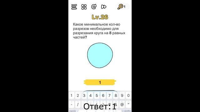 Какое минимальное кол-во разрезов необходимо для разрезания круга на 8 равных частей. 26 уровень
