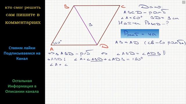 Геометрия Найдите периметр ромба ABCD, если угол A = 60, BD = 9 см.