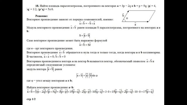 Решение, найти площадь параллелограмма, построенного на векторах a=3p−2q и b=p+5q пример 18
