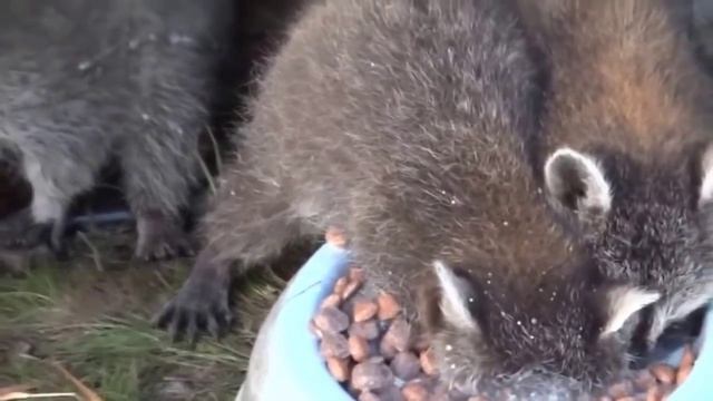 Жадный енот пьет молоко, ныряя в миску с головой