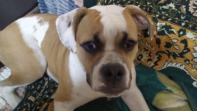 Перекус у щенка (пол года) американского бульдога Толи..