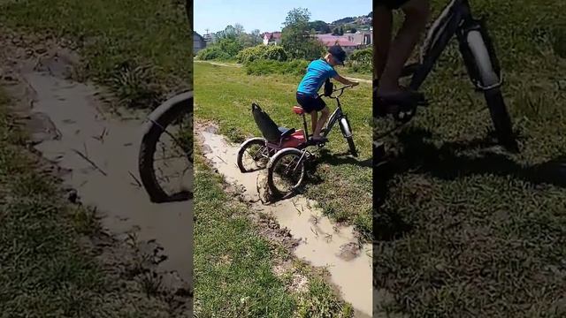 застрял в грязи на самодельном трёхколёсном велосипеде