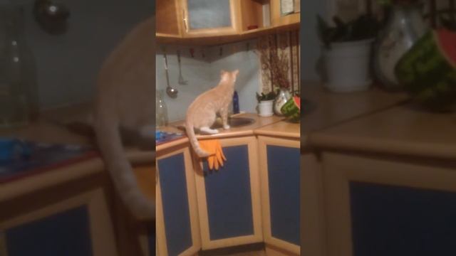 Кот моет посуду!