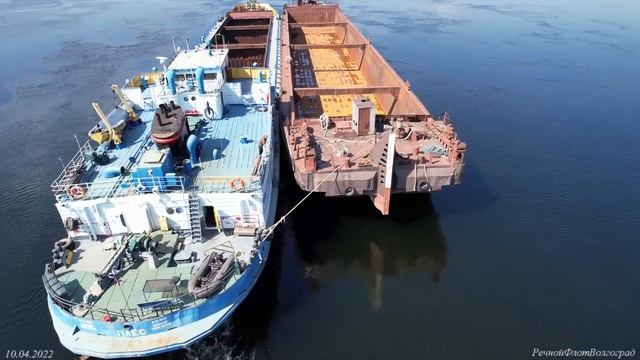Теплоход Плес с баржой с правого борта на Волге