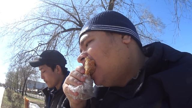 Обедаем с Денисом доку и вафлями на лавочке