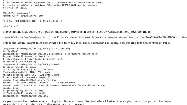 git post-receive hook throws "command not found" error but seems to run properly and no errors...