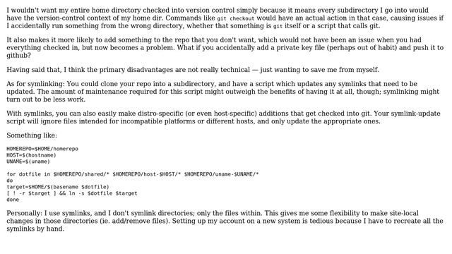 Unix & Linux: Are there pitfalls to putting $HOME in git instead of symlinking dotfiles?