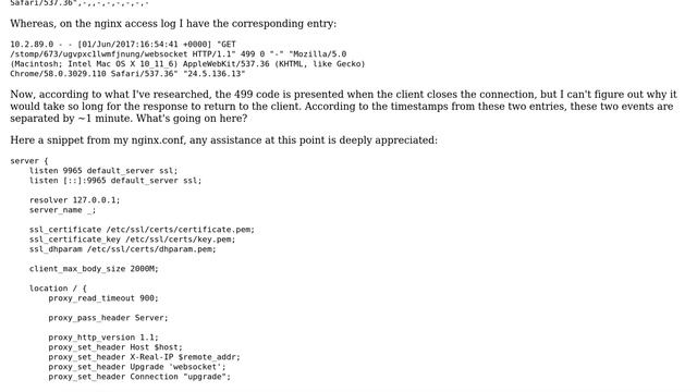 How to troubleshoot Nginx 499 when it's not returning a web sockets handshake back to the client?
