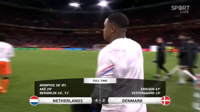 The Dutch and Danish players embrace Christian Eriksen after his brilliant return for Denmark.