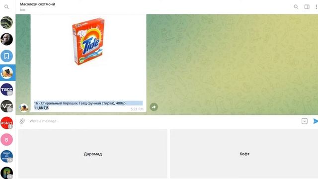 Санҷиши сохтани телеграм бот, барои ҷустуҷуи масолеҳ бо нарх аз сомонаи Бизон...