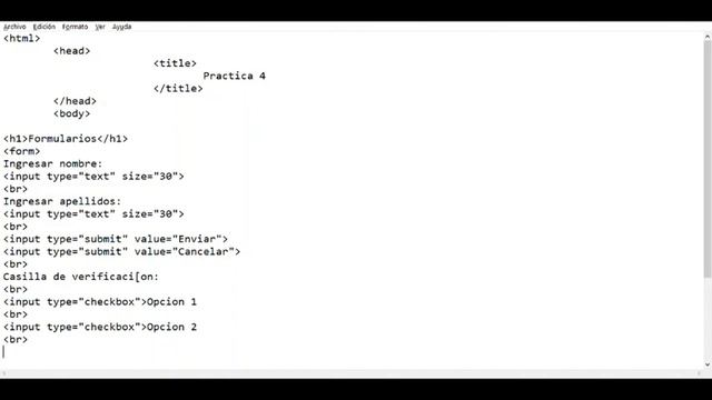 Código HTML para crear formularios y controles como botones y cajas de texto