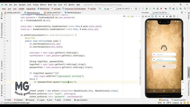 5 dars. login oynasi xatolik xaqida xabar berish.Android studio send warning.Miracle Group
