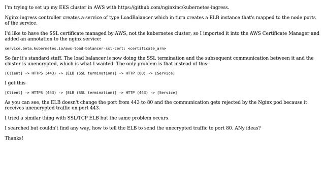 AWS kubernetes load balancer terminate SSL on port 443 and forward to service on port 80
