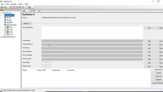 Test case and Test Suite different settings in Robot Framework(Ride Editor)
