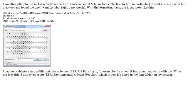 GIS: Using ESRI character font ("Environmental & Icons") with formatting tag in layout text box
