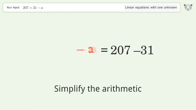 Linear equation with one unknown: Solve 207=31-a step-by-step solution